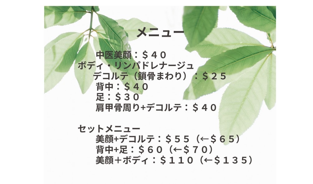 日本人の優し気な女性の方が、施術前に体の不調を聞いてくださり、施術内容を相談できます。 私は顎関節症であごの音が気になるのと、あごの開閉のしづらさを感じていたので、顔の筋肉ほぐしを中心に初回はお願いしました。